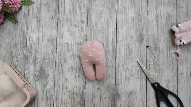 Выворачиваем обратно, набиваем наполнителем, зашиваем сверху. Нижняя часть игрушки готова.
