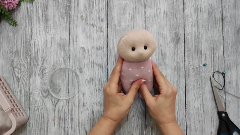 Через шов вставляем внутрь длинную иглу, пришиваем бусинки-глаза. Затем готовую голову пришиваем к телу игрушки.