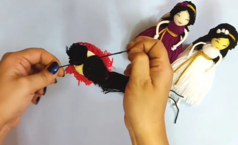 Для изготовления волос куколки потребуется кусочек картона размером 10 см на 10 см. Проведите аналогичную процедуру, что и при изготовлении платья. Для оформления прически понадобится две заготовки: первая из 20 витков нити, вторая — из 25 витков.