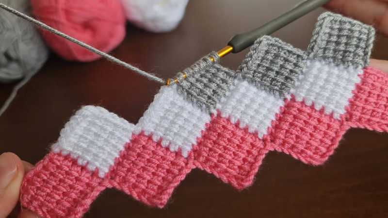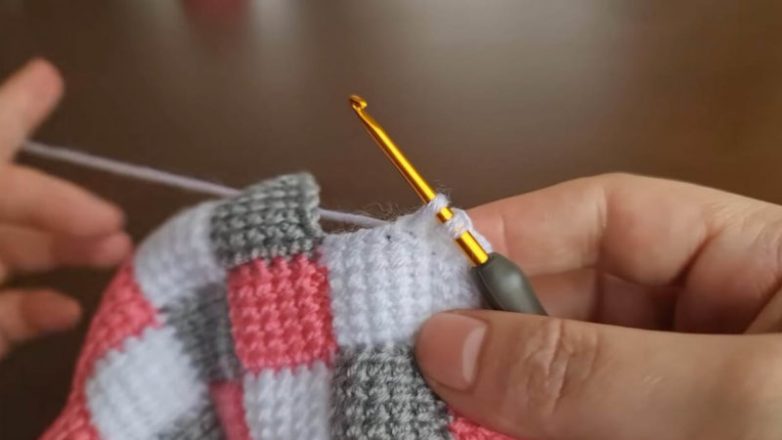 Сначала изделие вяжется справа-налево, по классике, а затем, в конце ряда — слева-направо, таким образом, возвращаясь к началу. Тунисский узор ниже вяжется именно таким образом, и в нём нет ничего сложного, главное — немного разобраться в технике и «набить руку».