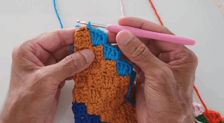 По ходу всего вязания при необходимости сменить цвет нити последний ССН всегда закрывается нитью другого цвета. При окончании работы с определенным фрагментом нить обрезается с запасом, при введении в работу очередного цвета также делается запас. Если в следующем ряду продолжается использование нити, то обрезать ее не нужно, достаточно просто отвести в сторону и перейти на работу с другим цветом.