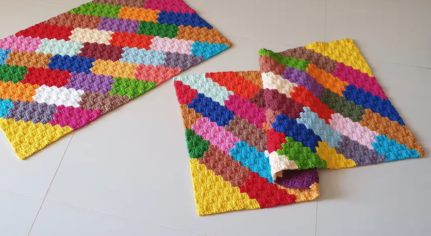 Практичный и симпатичный двусторонний коврик в стиле лего с четко обозначенной фактурой легко связать самостоятельно. С работой справятся даже начинающие вязальщицы, а все потому, что подсчеты и протяжки здесь отсутствуют, а освоить нужно всего 2 вида петель, не считая воздушных.