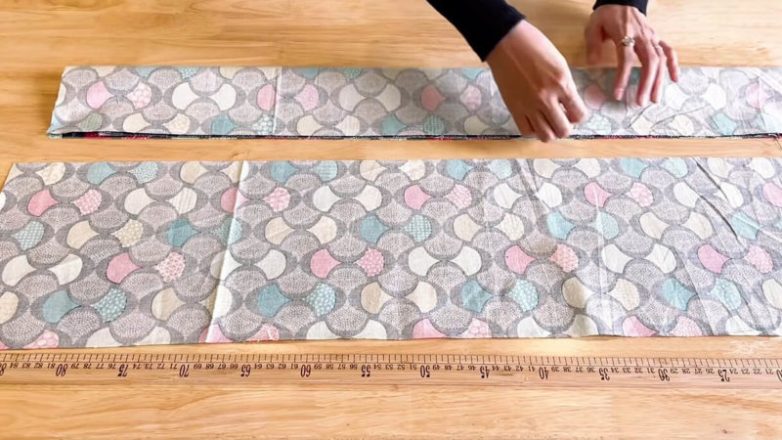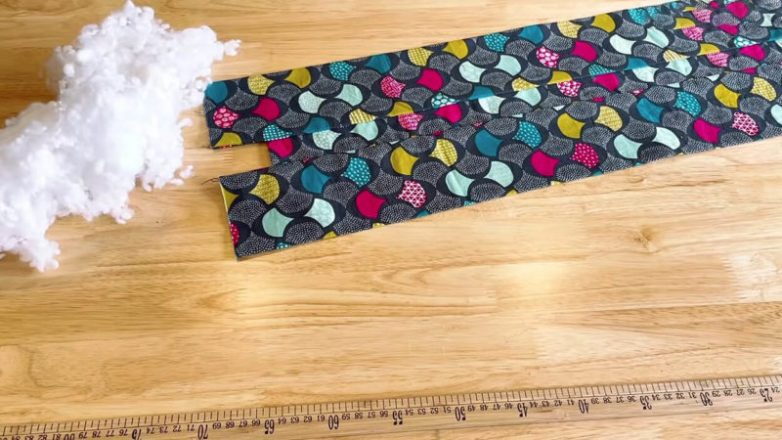 Замерьте дверь (ширину и длину). Из ткани вырежьте соответствующую замерам деталь (получится примерно 75*4 см), но добавьте к каждой цифре + 2 см на швы. Также вырежьте ещё две одинаковые заготовки: с длиной, соответствующей длине двери (около 75 см) и с шириной 22 см.