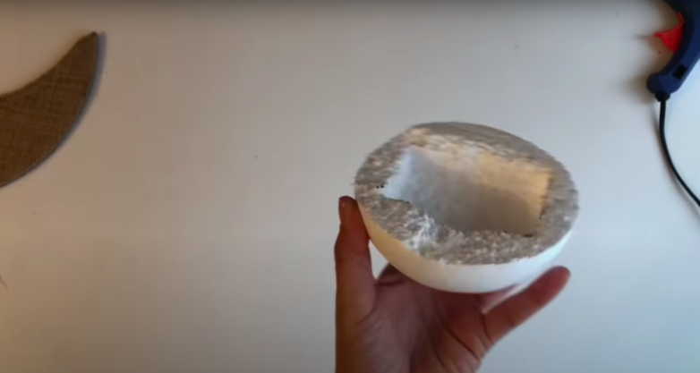 Теперь необходимо подготовить подставку для будущего светильника. В нашем случае для этого используется пенопластовый шар, вернее его половина. В получившейся полусфере намечаем, а затем вырезаем выемку для каркаса-полумесяца.