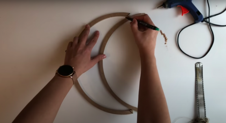 Для каркаса в данном случае можно использовать пяльцы или кольцо из плотного картона. В любом случае первоначальную заготовку разрезаем на 2 примерно одинаковые части. Затем складываем получившиеся половинки так, чтобы у вас получился полумесяц. На места соединения наносим разметку, чтобы в дальнейшем срезать лишнее и получить ровный контур.
