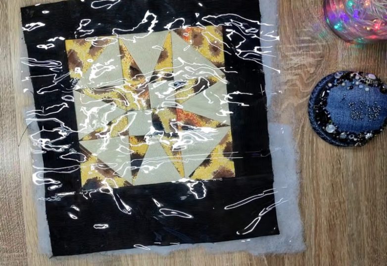 Накройте заготовку виниловой пленкой и вновь закрепите лоскуты с помощью стежки.