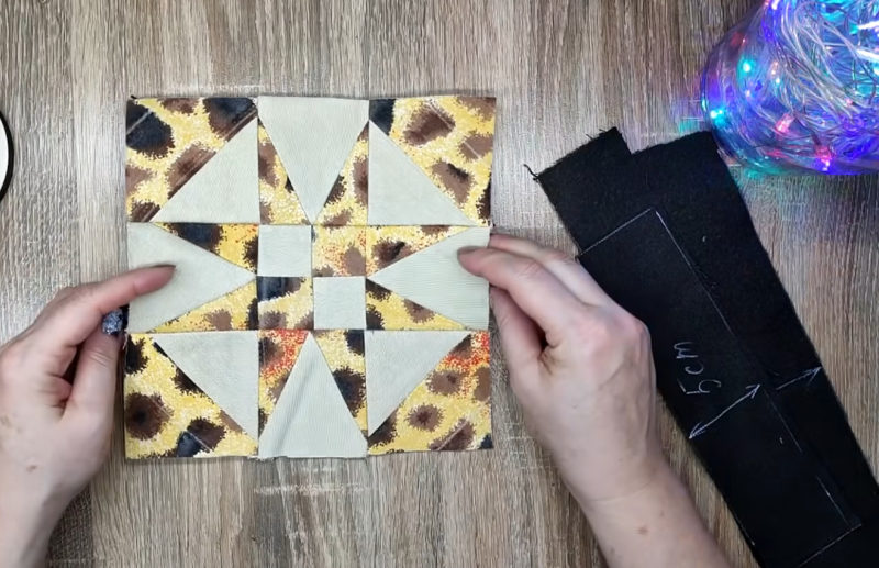Окантуйте заготовку полосами контрастной ткани шириной по 5 см по трем сторонам и полосой шириной 8 см по нижней стороне.