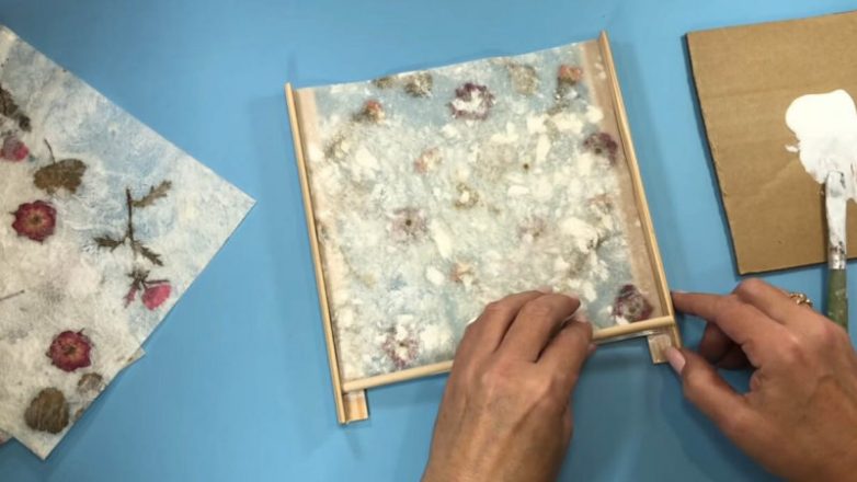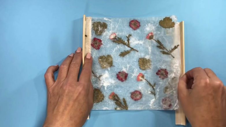 Уберите плёнку сверху. Разложите поверх тонкого бумажного пласта сушёные цветы и листочки на свой вкус.