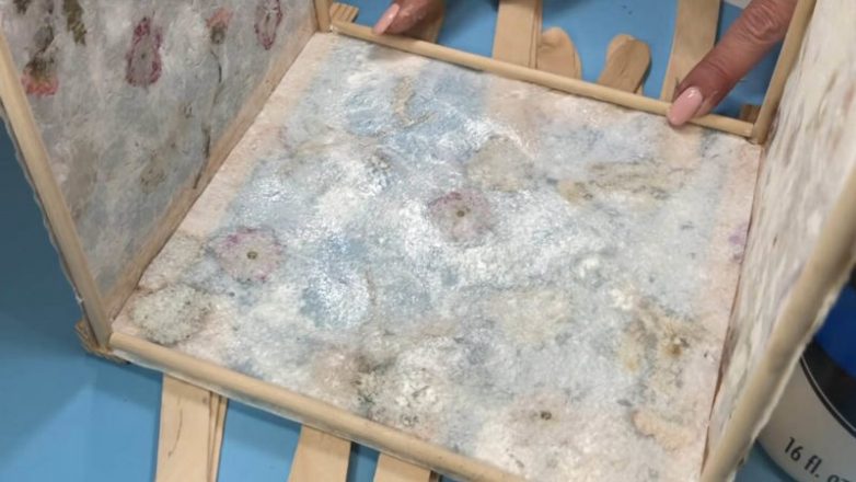 Наконец, оставшиеся две бумажные пластинки с цветами приклейте по очереди к двум сторонам с уголками, подложив под низ и по бокам что-нибудь для устойчивости. Затем то же самое проделайте с оставшейся стороной. Не забывайте также приклеивать шканты!