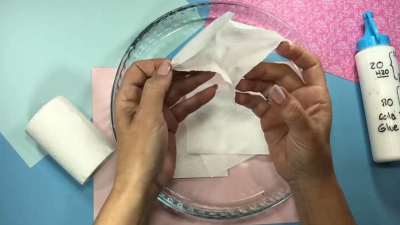ПВА клей смешайте с водой в пропорции 80:20. Туалетную бумагу разделите на кусочки и слои, порвите на кусочки поменьше. Добавьте клей с добавлением воды в указанных пропорциях до тех пор, пока бумага не соберётся в комок (не добавляйте слишком много). Когда бумажный комок станет липнуть к рукам, добавьте буквально 1 ст. л. воды или чуть больше, чтобы «тесто» стало более пластичным и менее липнущим к рукам (оно не должно быть слишком влажным).