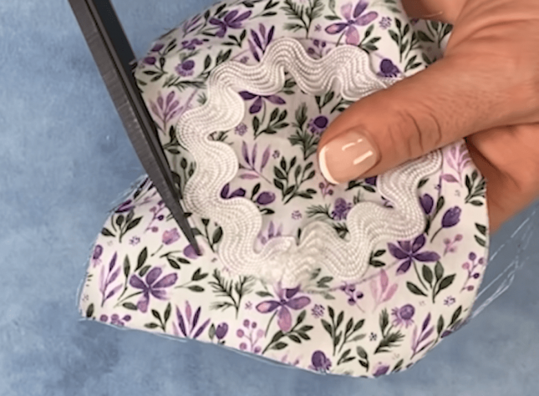 Обводим маленький шаблон, но в этот раз переносим его только на 1 квадрат. Вдоль метки прокладываем волнистую тесьму. При желании ее можно заменить кружевом или рюшей. Обрезаем ткань с отступом в 0.3 см от нанесенной метки. И только после этого, перевернув заготовку лицам вниз, состыковываем ее со вторым квадратом.