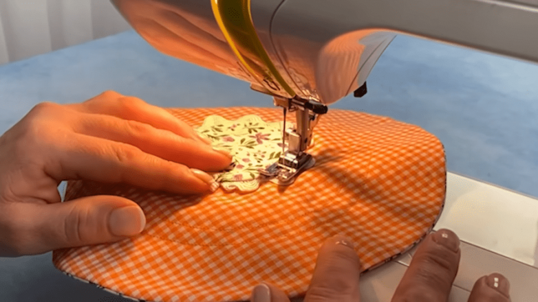 Скрепляем между собой полотна при помощи портновских булавок, а затем прокладываем строчку ровно по наметке. Оставляем незастроченным техническое отверстие размером в 2.5-3 см. Обрезаем излишки ткани с учетом припуска в 0.3 см.