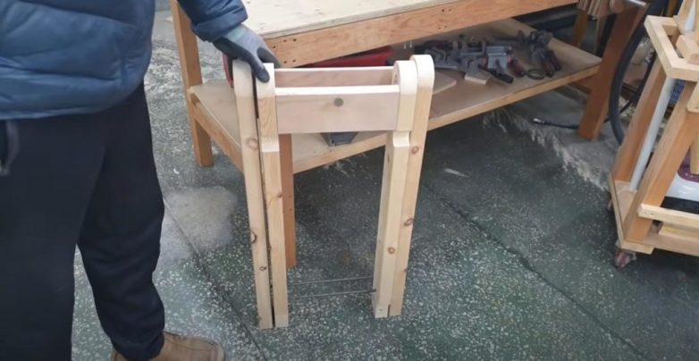 Сначала изготавливаем первую пару ног: отпиливаем по размеру доски и высверливаем в них отверстия. В нижней части соединяем с помощью резьбовой шпильки, а в верхней — крепится дощечка из фанеры.