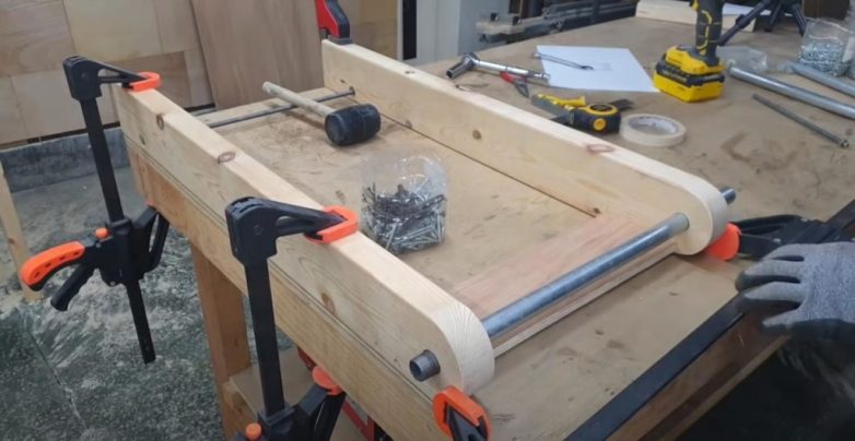 Столешницу вырезаем из листа фанеры. По бокам прикручиваем к ней доски, в которых высверливаем по два отверстия по краям для установки трубы.