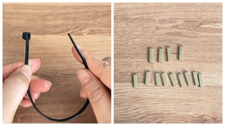 Чтобы сделать деления, нарезаем одинаковые отрезки от обычной пластиковой стяжки и красим их золотом. Этой же краской покрываем стрелки и рамку.