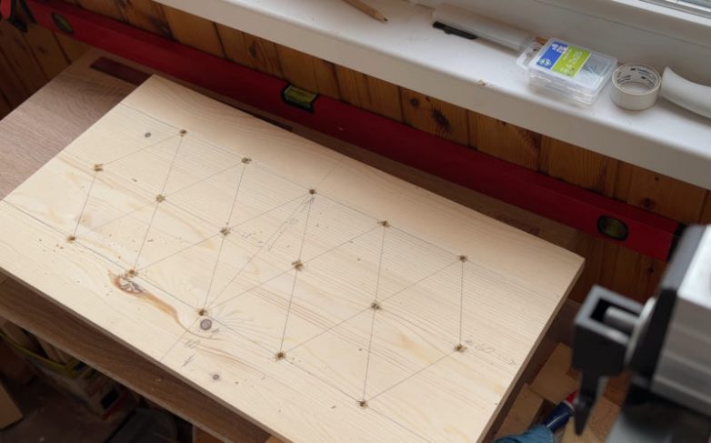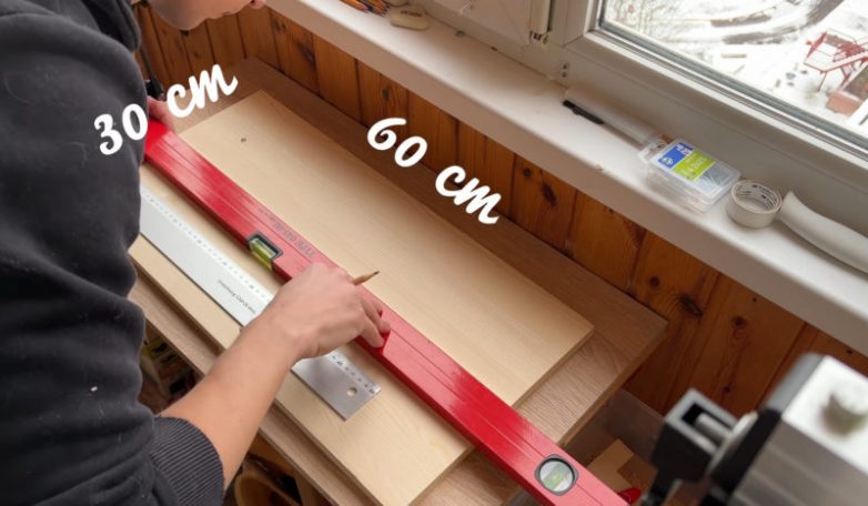 Подготовьте деревянную основу размером 30 см на 60 см. Сделайте на основе разметку, отметив места расположения каретной стяжки.