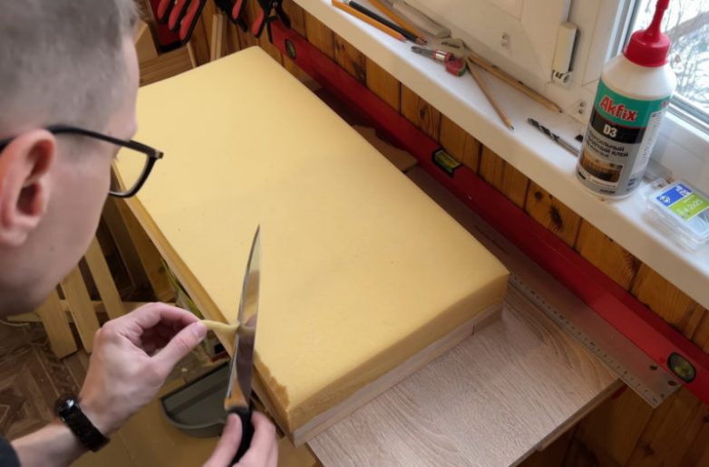 Приклейте на основу поролон толщиной 5 см и слегка срежьте края, чтобы сделать заготовку более обтекаемой.