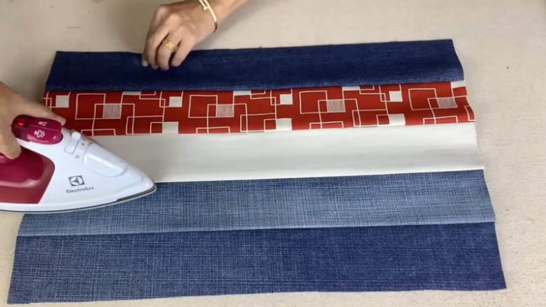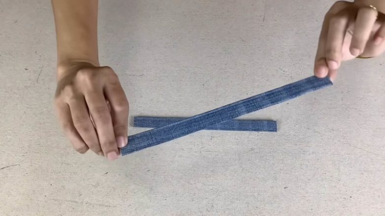 Вырежьте из джинсов разных цветов по две полосы каждого цвета соответствующего размера.