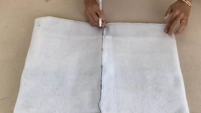 Половинка круга, замеренная ранее сантиметром, будет составлять примерно 57,5 см. Округлите до 60 см, добавив по полтора сантиметра на швы. Высоту подберите самостоятельно, в работе используется 9 см.