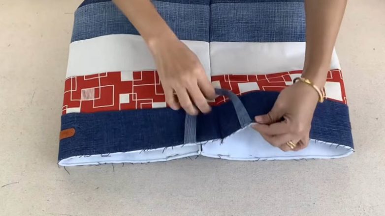 Пришейте ранее сделанные джинсовые ручки.