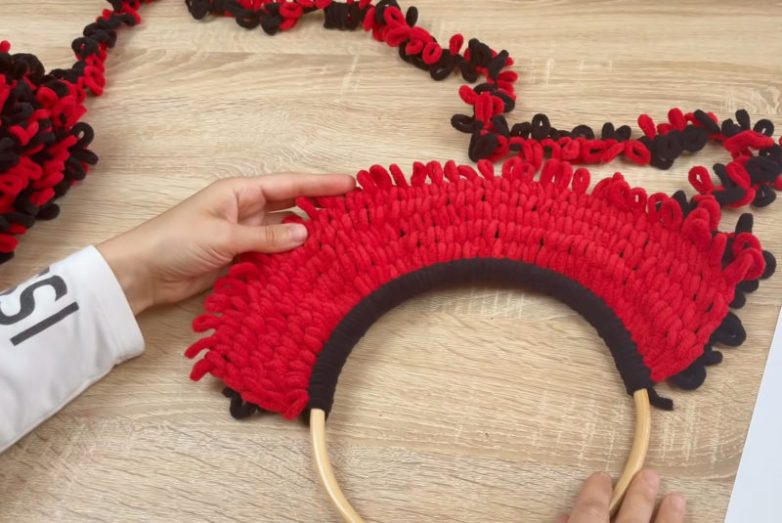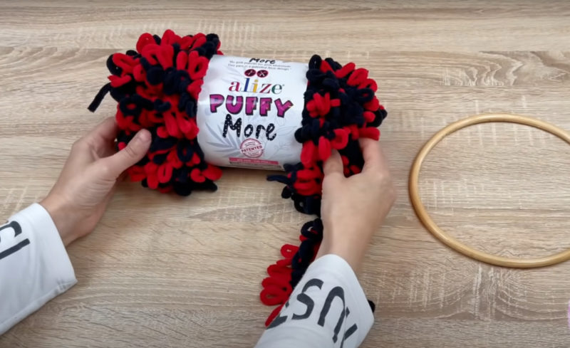 Для ручки сумки будут использованы два деревянных кольца диаметром 15-17 см. Положите кольцо на пряжу и с помощью вязального крючка проведите красную петлю через черную.