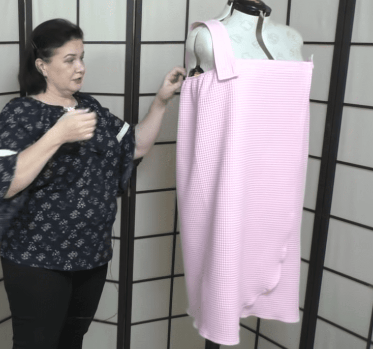 Длина изделия без учета бретелей составляет 95 см, что близко к показателям банного полотенца. Ширина же увеличена на величину запаха. По сути спереди ткань просто ложится внахлест и дополнительно фиксируется сверху, не сковывая при этом движений снизу.