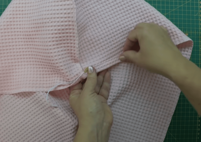 Для лучшего прилегания в широкой части дополняем шапочку резинкой. Берем резинку длиной 25 см, складываем пополам и совмещаем с линией шва. Затем встрачиваем в подворот в растянутом виде сначала с одной стороны, а после с другой.