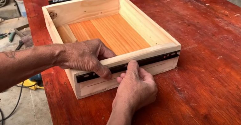 На следующем этапе приступаем к изготовлению выдвижного ящика. По бокам прикручиваем ответные планки от мебельной направляющей. Сами направляющие крепим внутри комода.