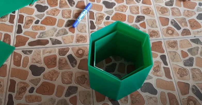 Отрезаем заготовку требуемой длины, после чего размечаем ее и делаем пять пропилов на одинаковом расстоянии друг от друга. Сгибаем форму в шестиугольник. Края фиксируем скотчем.