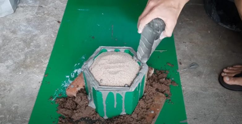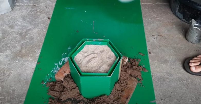 Засыпаем внутреннюю опалубку песком. Свободное пространство между двумя частями формы заливаем цементным раствором.