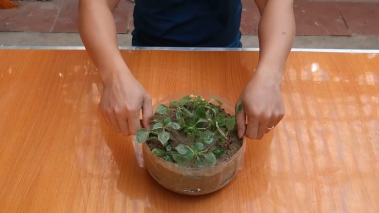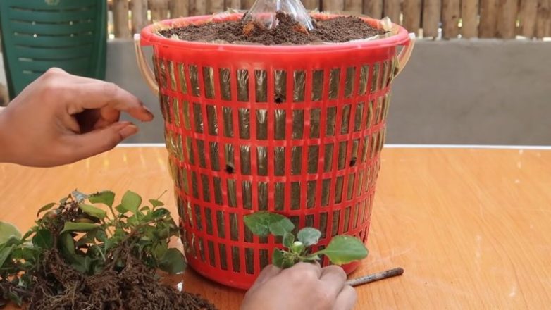 Заранее подготовьте черенки выбранного цветка. Это может быть бальзамин или петуния, например. Замочите их в растворе Корневина, согласно инструкции, и после этого временно высадите во влажный песок на 3-5 дней. Также подготовьте ведро, которое выстелите внутри пакетом. Примерьте пластиковую бутылку, в которой сверху по кругу сделайте 5-6 отверстий паяльником (или горячим гвоздём, например).