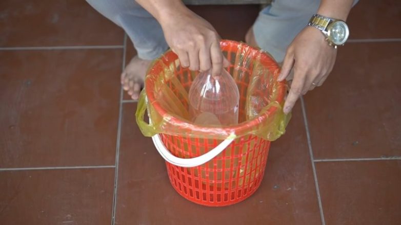 Установите бутылку в центр ведра. Засыпьте её питательным грунтом. Лишнюю длину пластикового пакета отрежьте.