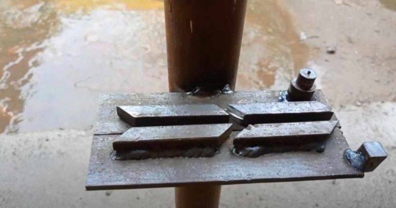 На следующем этапе отрезаем четыре заготовки из стального квадратного прутка, и привариваем их к основанию.