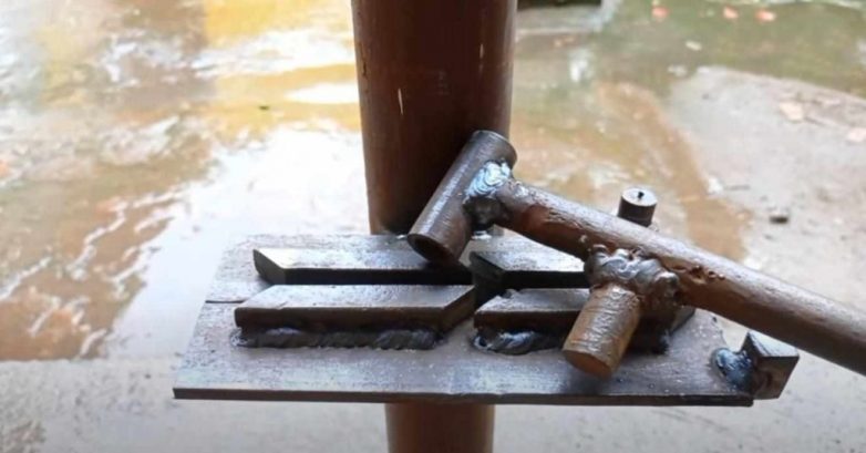 В завершении останется только изготовить ручку-рычаг. В данном случае автор использовать кусок стального кругляка и вторую часть гаражной петли.