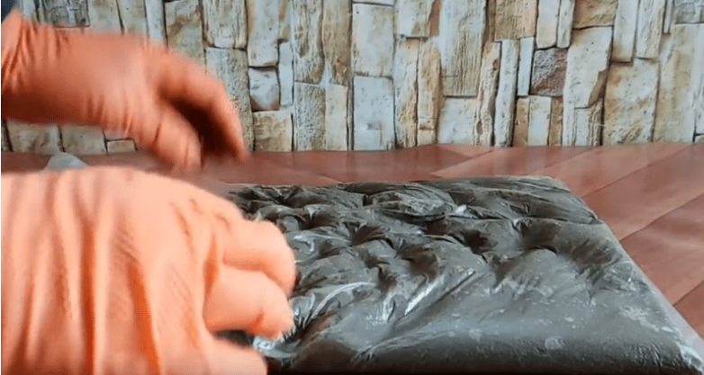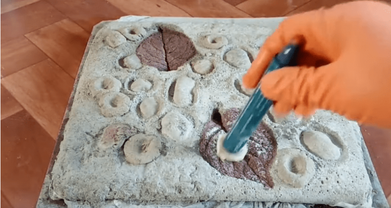 Примерно через 30-60 мин, когда цемент уже будет более менее держать форму, но все еще останется довольно пластичным, разрезаем пакет и выделяем декор. В случае с листьями – аккуратно убираем их, чтобы остался рисунок, а в случае с камнями – убираем с них раствор, делая их более заметными.