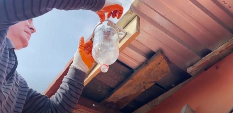 Крепим бутылку к ветровой доске. На горлышко надеваем гофрированный шланг и закрепляем его на стене дома. Отводим воду в нужное место.