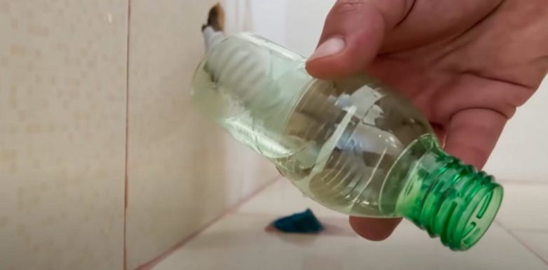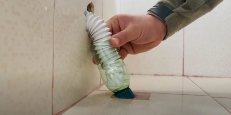 Дальше все просто: вставляем гофру в пластиковую бутылку как можно глубже, а горлышко бутылки — в канализационную трубу. Готово!
