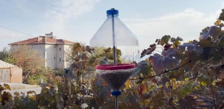 У бутылки отрезаем дно. Подбираем под нее крепежный хомут. Если нет хомута, можно зафиксировать бутылку с помощью проволоки.