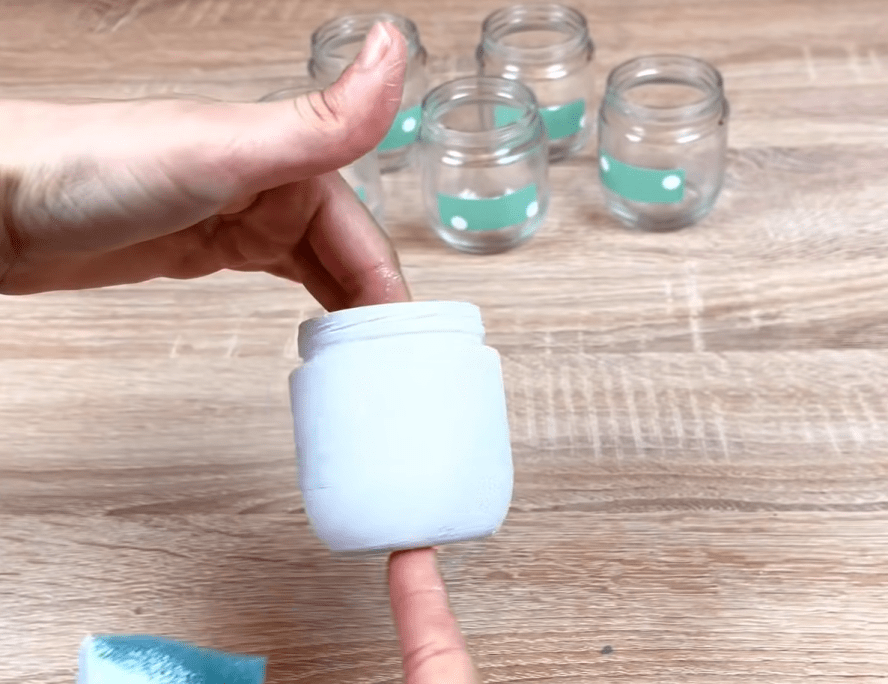 После полного высыхания покрываем баночки и крышки акриловым лаком для камня. Это необходимо для того, чтобы баночки в ходе эксплуатации могли свободно контактировать с водой.
