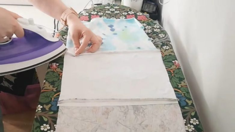 Соберите «бутерброд» из ткани для низа, тонкого одеяла и сшитого лоскутного полотна из старых вещей наверху. Сколите всё булавками, край подверните и прошейте на машинке.
