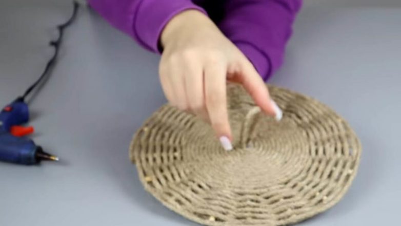 Оклейте диск с одной стороны верёвкой. Сверху приклейте ещё один диск. На нём сделайте петельку-ручку. Продолжите оклеивать диск верёвкой по кругу.