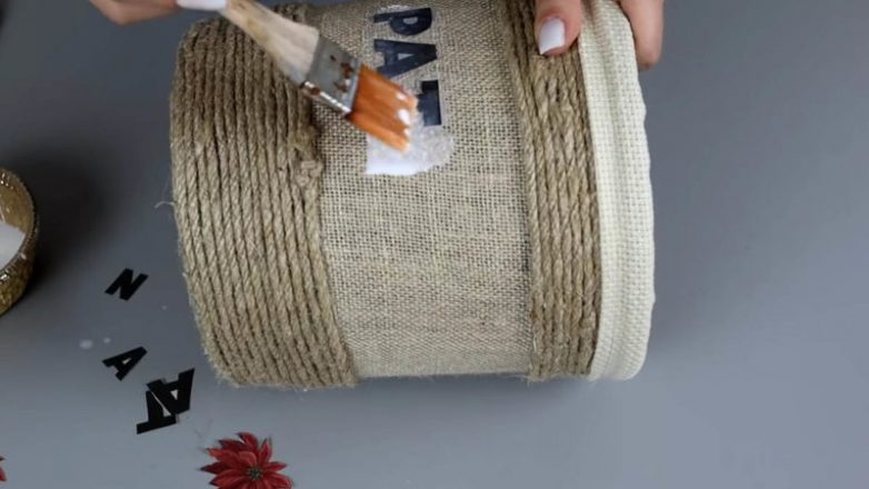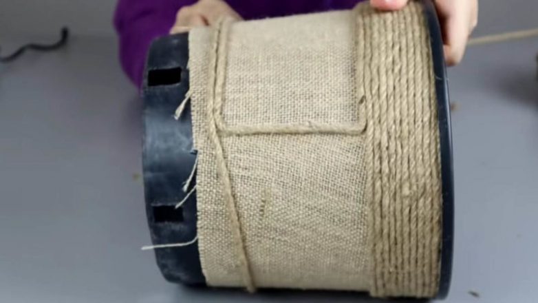 У ведра уберите ручку. По центру приклейте мешковину.