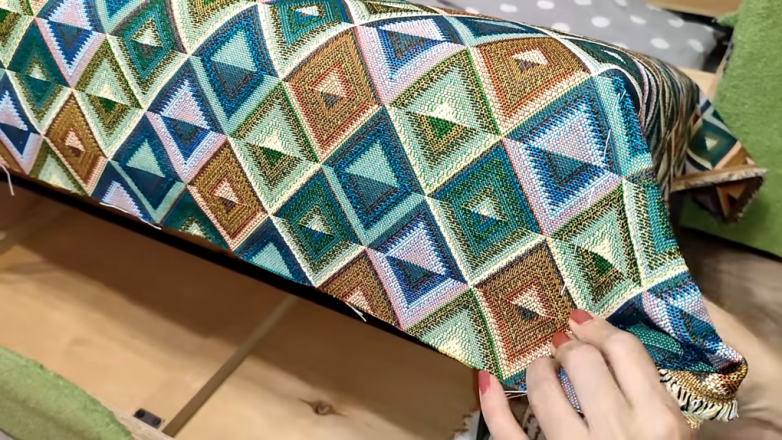 Раскручиваем крепеж. Снимаем старую обивку, смотрим, требует ли замены поролоновая составляющая. Чтобы обойтись без замеров, накрываем деталь новой обивочной тканью так, чтобы края со всех сторон свисали равномерно и их хватало, чтобы перекрыть высоту и сделать подгиб. Отрезаем необходимое количество ткани и укладываем его лицом вниз. Хорошо расправив ткань, формируем углы, складываем ткань вдвое и делаем вручную наметочный шов. Намечаем так все 4 угла. После аккуратно снимаем ткань, прошиваем вручную или застрачиваем на машинке углы.
