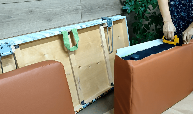 Дальше остается сострочить между собой детали, расположив их лицом внутрь, вывернуть, затем натянуть на боковушки и закрепить снизу при помощи степлера. Еще одним дополнением станут обновленные ножки, прикрепленные к боковушкам попарно снизу.