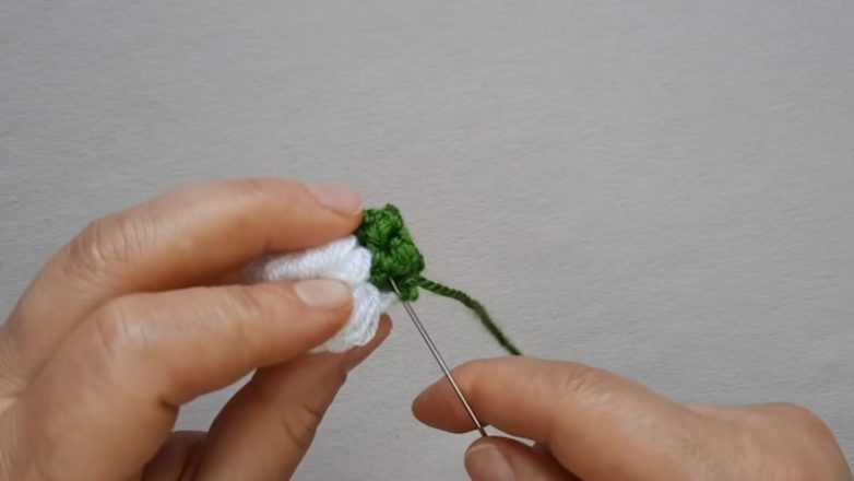 Вденьте в иглу зелёную пряжу и прошейте по ранее сделанным узлам новые, уже зелёной пряжей. Сделайте несколько рядов, чтобы зелёную пряжу было хорошо видно.