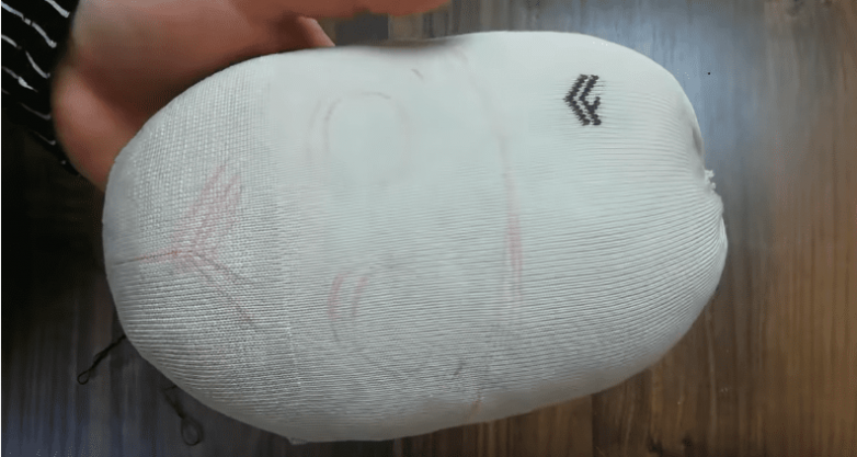 Далее берем носок подходящего цвета и набиваем его примерно до середины, обрезаем, а затем сшиваем. Таким образом мы получим заготовку для головы. Намечаем на ней мордочку и «линию роста волос». Носик и рот прошиваем нитью.