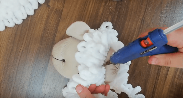 На следующем этапе нам потребуется пряжа. Лучше всего взять детскую пряжу alize puffy — она в данном случае подойдет идеально. Пряжу пришиваем или приклеиваем с передней стороны заготовки.