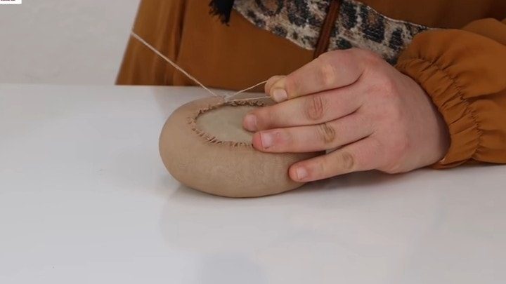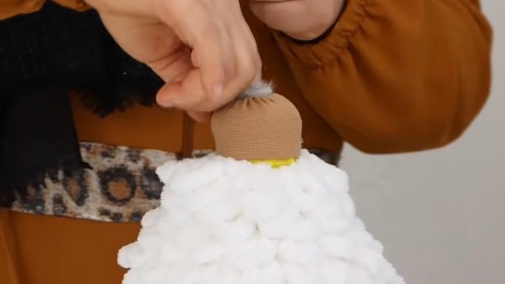 На крышку от бутылки (так, чтобы она впоследствии открывалась) наклеиваем полоску нейлона, соединяем в кольцо. Потом собираем по краю, набиваем и закрепляем нить. Это шея.