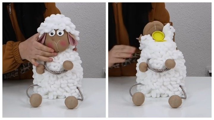 Очаровательная овечка готова! Между прочим, это не просто игрушка — в неё запросто можно что-то насыпать или сделать копилкой.