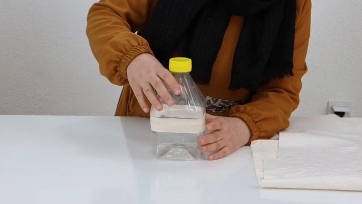 От пластиковой бутылки отрезать низ и верх. Подровнять края и склеить между собой полоской ткани.